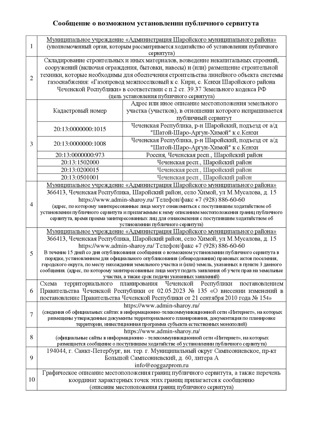 Сообщение о возможном установлении публичного сервитута - Администрация Шаройского муниципального раойна